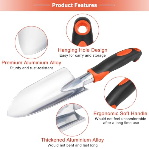[Ergonomic Design]: The handle is designed with contoured finger grips and palm rest to reduce hand fatigue and strain while planting. The high-quality TPR material of the handle makes the trowel garden tool easy to hold and comfortable to use. Saving your labor, time and energy. The hanging hole on the top makes the garden tools for gardening easy to carry and store.