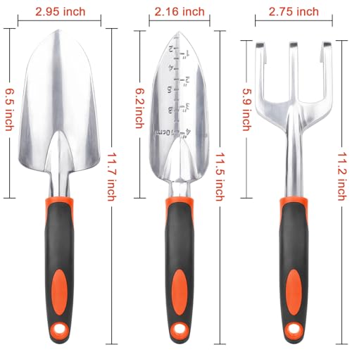 [3 Piece Garden Tool Set]: The gardening hand tools set includes a garden trowel, a garden rake and a transplanting spade with graduated scale. Great gardening supplies for weeding, digging, transplanting, planting, loosening soil, etc. The great lawn and garden tools to meet most of your daily gardening needs.